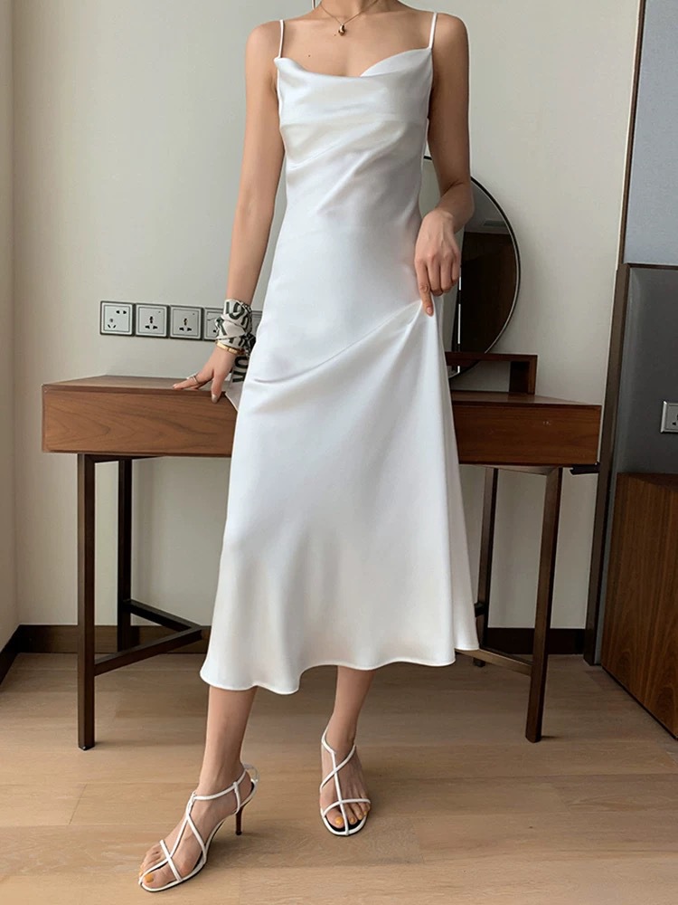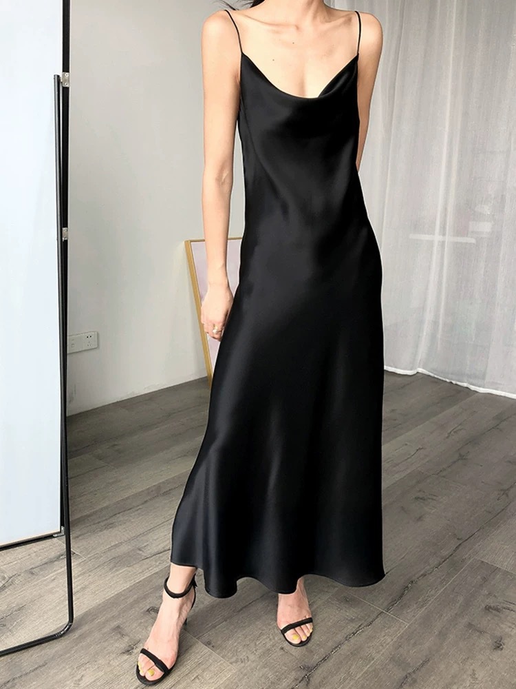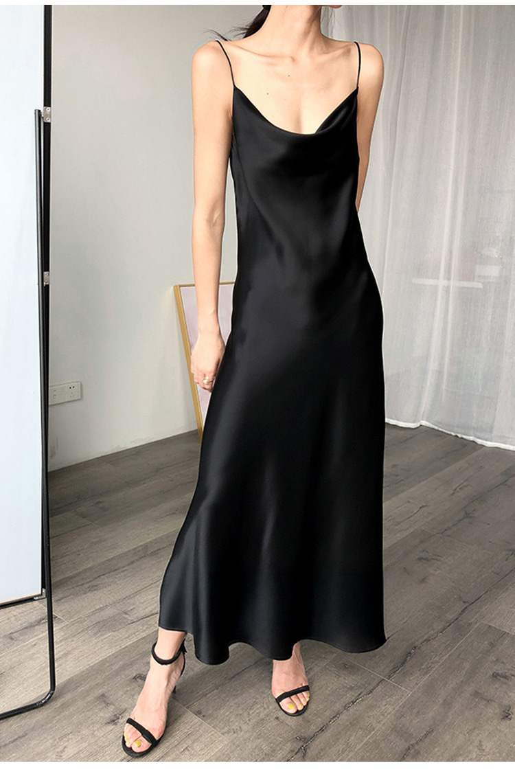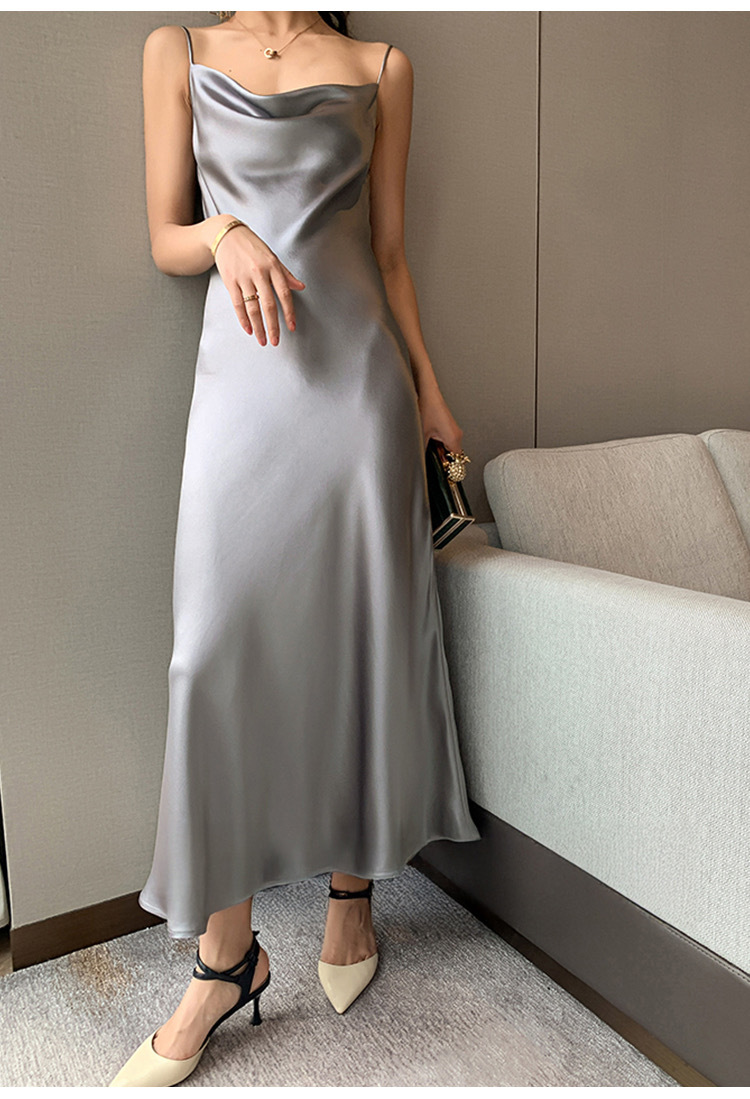 The 45-degree bias cut helps create a naturally flattering silhouette, while the draped swing collar neckline adds sophisticated softness around the face and shoulders. This sleeveless A-line long dress is ideal for autumn layering or wearing solo for a clean, modern look.