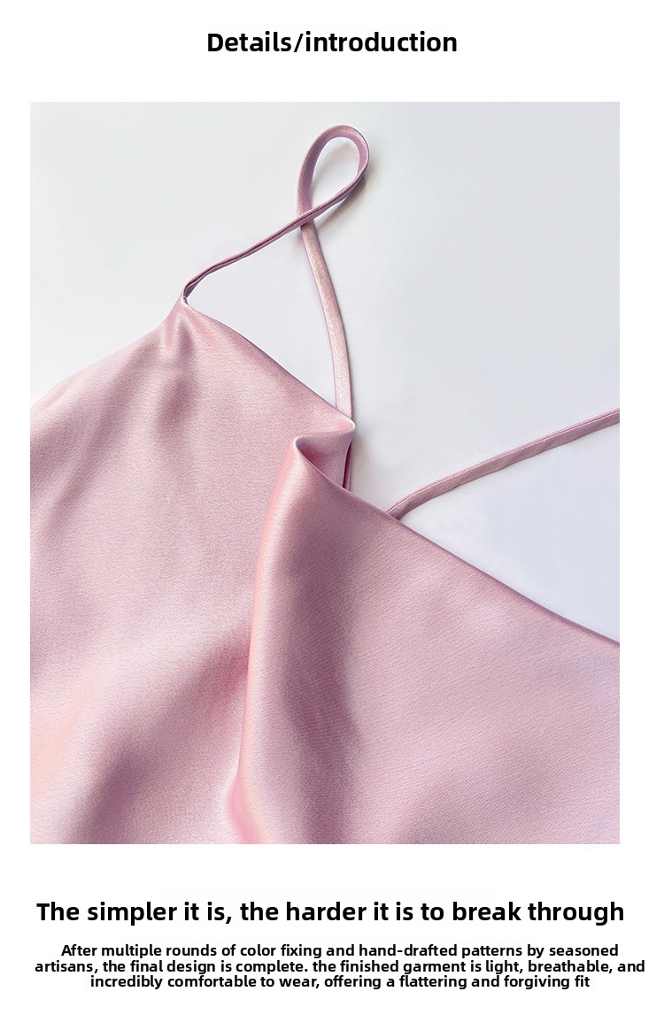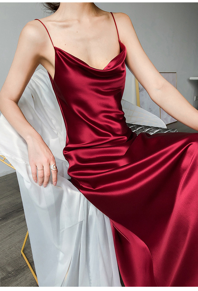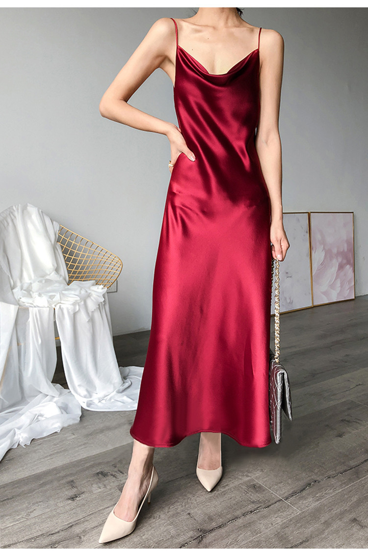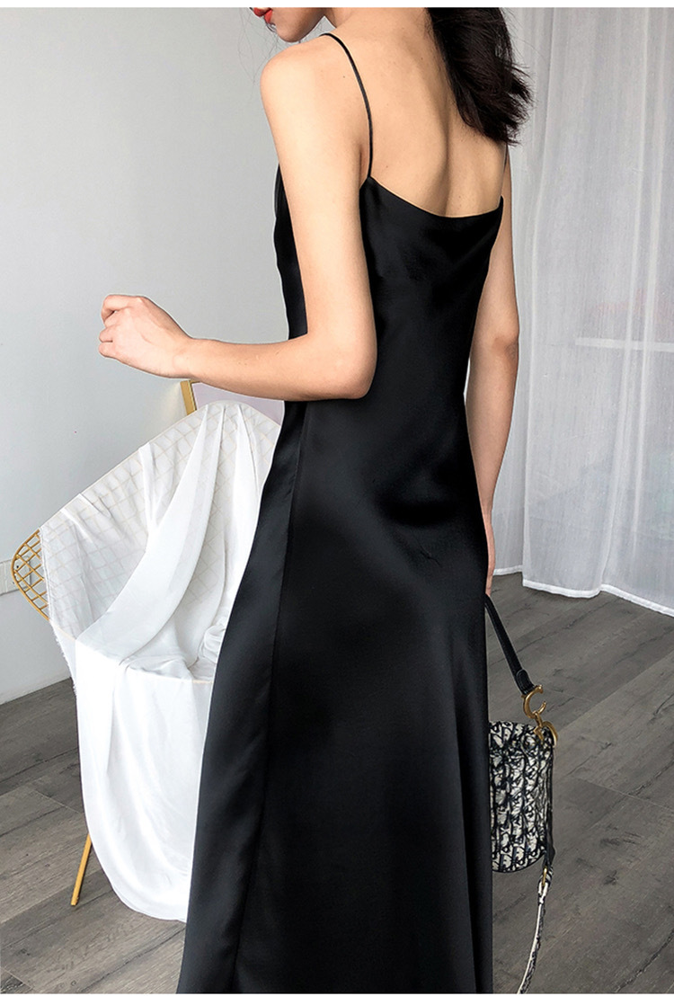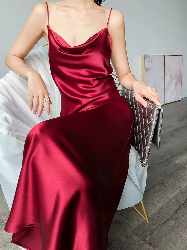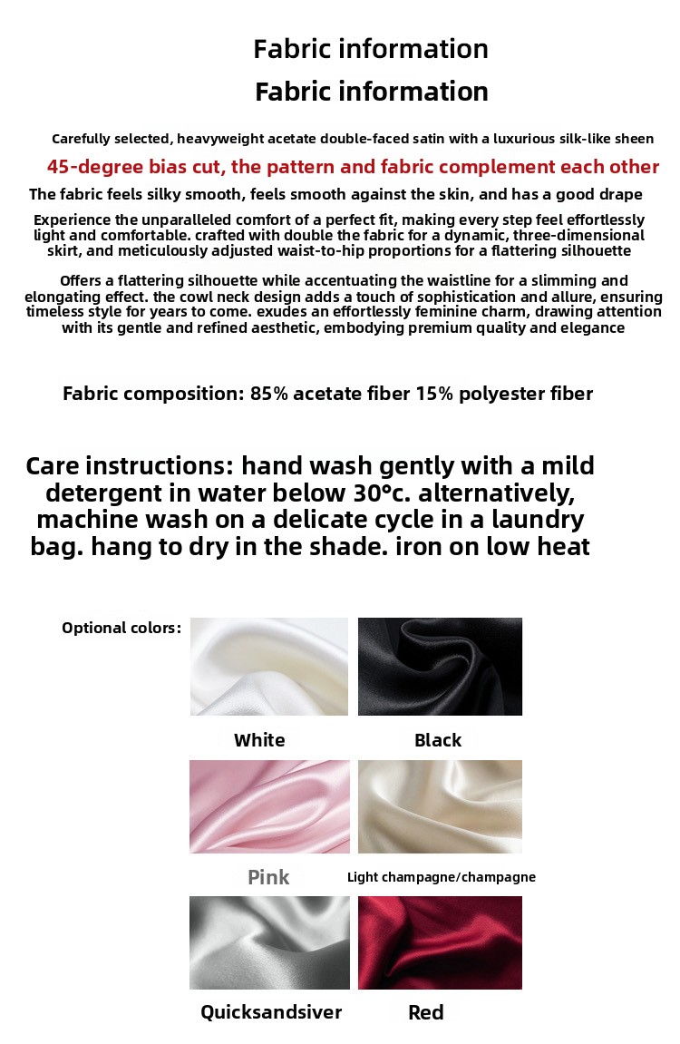 Meet the Sleek Sleeveless Bias-Cut Dress for Effortless Style—crafted from imported acetate satin (triacetate fiber blend) for a smooth, premium feel and an elegant, fluid drape.
